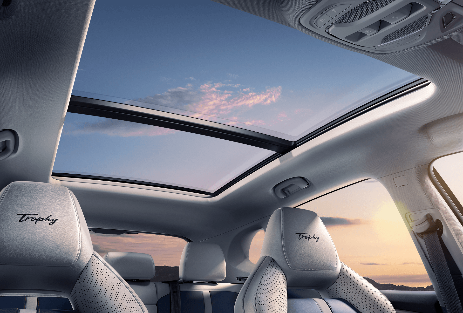 Vửa sổ trời toàn cảnh rộng nhất phân khúc, chiếm đến 90% diện tích trần xe với 7 cấp độ mở. Diện tích của cửa sổ trời toàn cảnh này lên đến 1,19 m2 và có thể mở ra 0,51 m2.